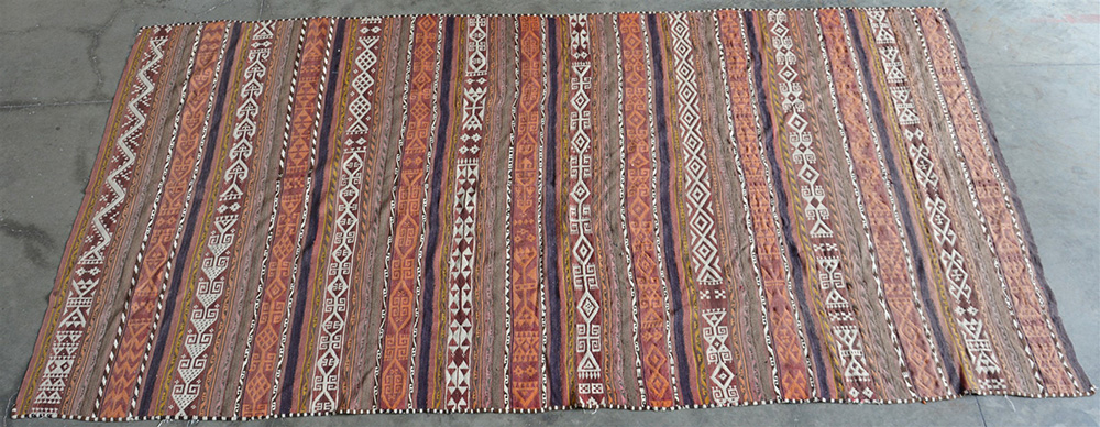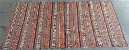 [Tappeti] Tappeto Kilim Djadjim, Uzbekistan-Turkestan occidentale, secolo XX. Disegno geometrico nei toni del rosa, marrone, bianco e giallo. (cm 365x191) (difetti e mancanze)