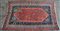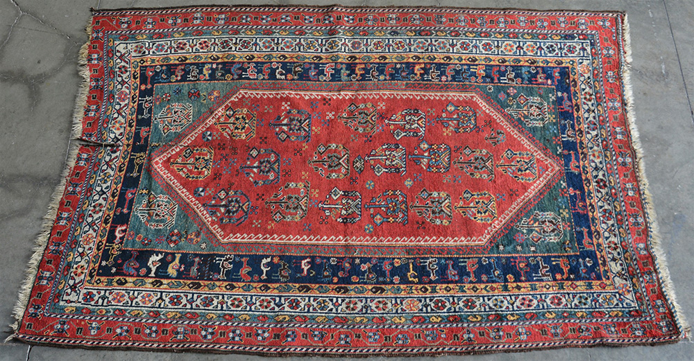 [Tappeti] Tappeto Khamseh, Persia meridionale, fine secolo XIX. Disegno floreale stilizzato policromo in file ripetute su fondo rosso: Angolari a fondo verde. Una grande bordura interna con galli stilizzati su fondo blu. Bordura esterna a meandro su fondo rosso. (cm 240x160) (gravi difetti)