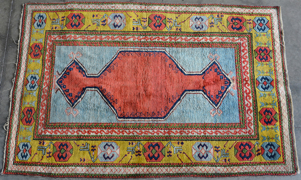 [Tappeti] Tappeto Azeri, Russia meridionale, secolo XX. Disegno ""Bachshaish"" con medaglione a fondo rosso a doppia nicchia e campo color azzurro. Bordura principale a fondo giallo limone (cm 196x134)(difetti)