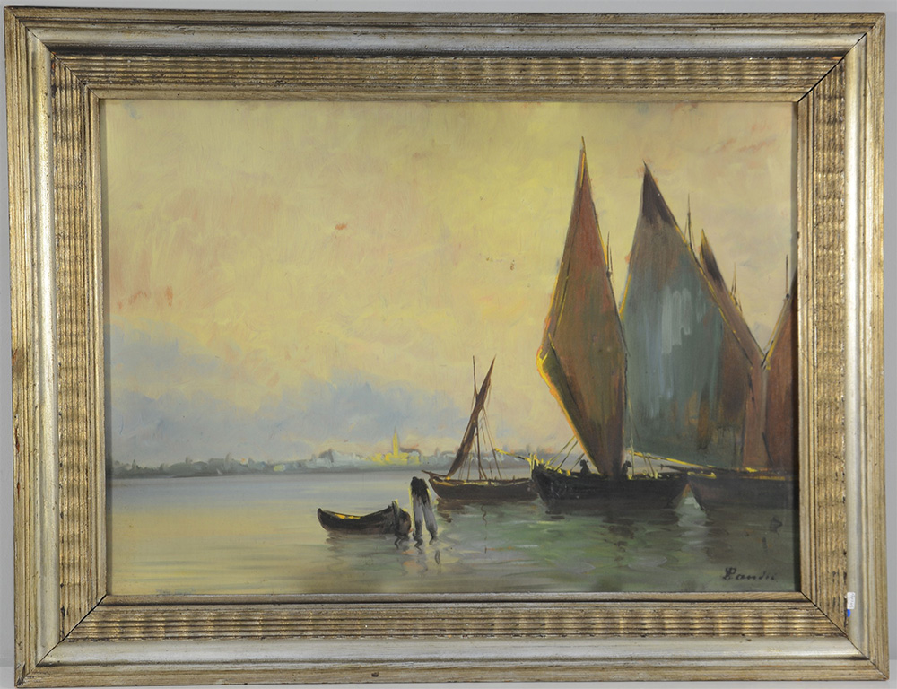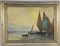 Firma indecifrata "Paesaggio marino con barche" olio su compensato (cm 48x68)...