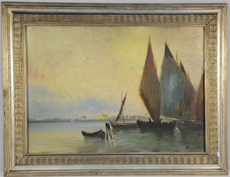 Firma indecifrata "Paesaggio marino con barche" olio su compensato (cm 48x68) firmato in basso a destra, in cornice