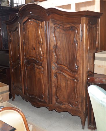 Armadio a tre ante riquadrate in stile settecentesco, fasce e gambe sagomate (cm 200x200x64) (difetti)