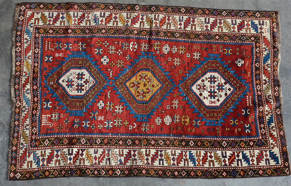 [Tappeti] Tappeto Shirwan, Caucaso, secolo XIX. Disegno a tre medaglioni policromi romboidali su fondo rosso, bordura a calici e foglie dentate su fondo bianco. (cm 170x116)da donna"