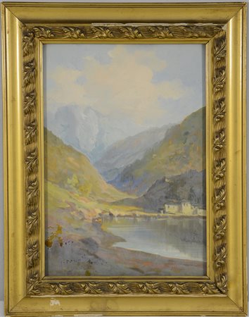 Ignoto "Paesaggio montano con laghetto" olio su cartone (cm 34x24) in cornice