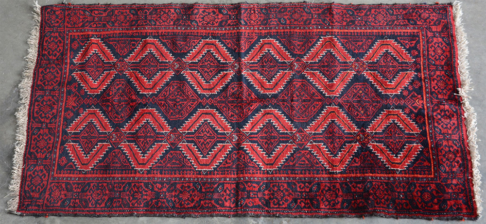 [Tappeti] Tappeto Kizil Ajak, Turkestan occidentale, secolo XX. Disegno geometrico nei toni del rosso, bianco su fondo marrone. (cm 177x97) (difetti)