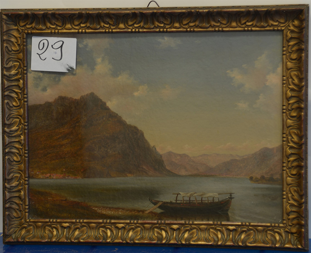 Ignoto "Scorcio del lago di Como" olio su Cartone (cm 30x40) in cornice (difetti)