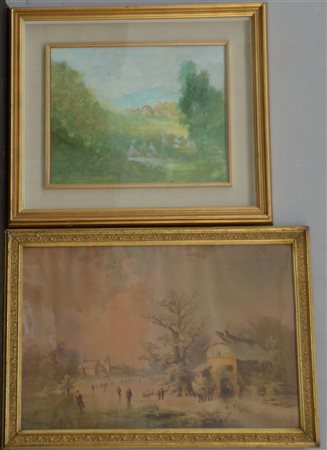 Lotto composto da un dipinto raffigurante un paesaggio e da un'oleografia raffigurante paesaggio invernale