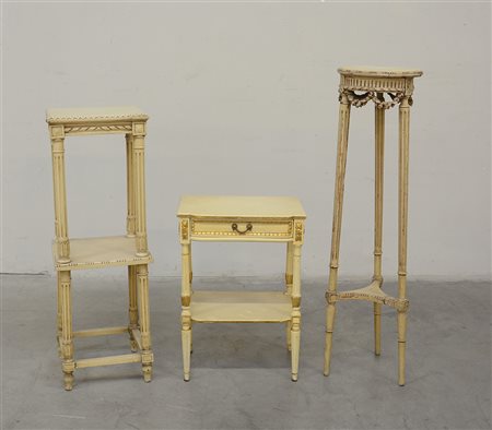 Lotto composto da due gueridon ed un comodino in legno laccato (difetti)