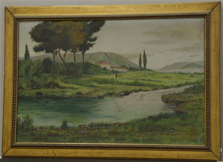 Firma indecifrata "Paesaggio con corso d'acqua" olio su tela (cm 80x120) firmato in basso a destra, in cornice (gravi difetti)