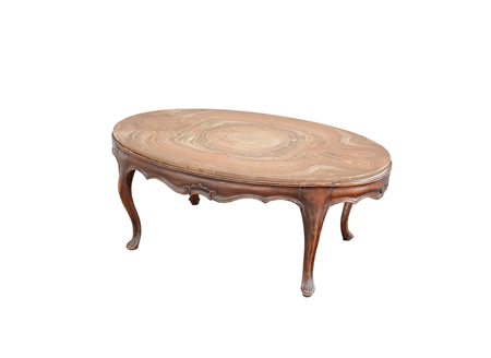 Tavolo da salotto ovale con piano lastronato in alabastro. Gambe e fascia in legno sagomato ed intagliato (cm 120x48x74)(difetti)