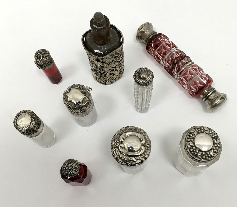 Lotto composto da nove portasale/portaprofumo in argento e vetro (difetti)