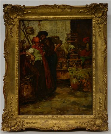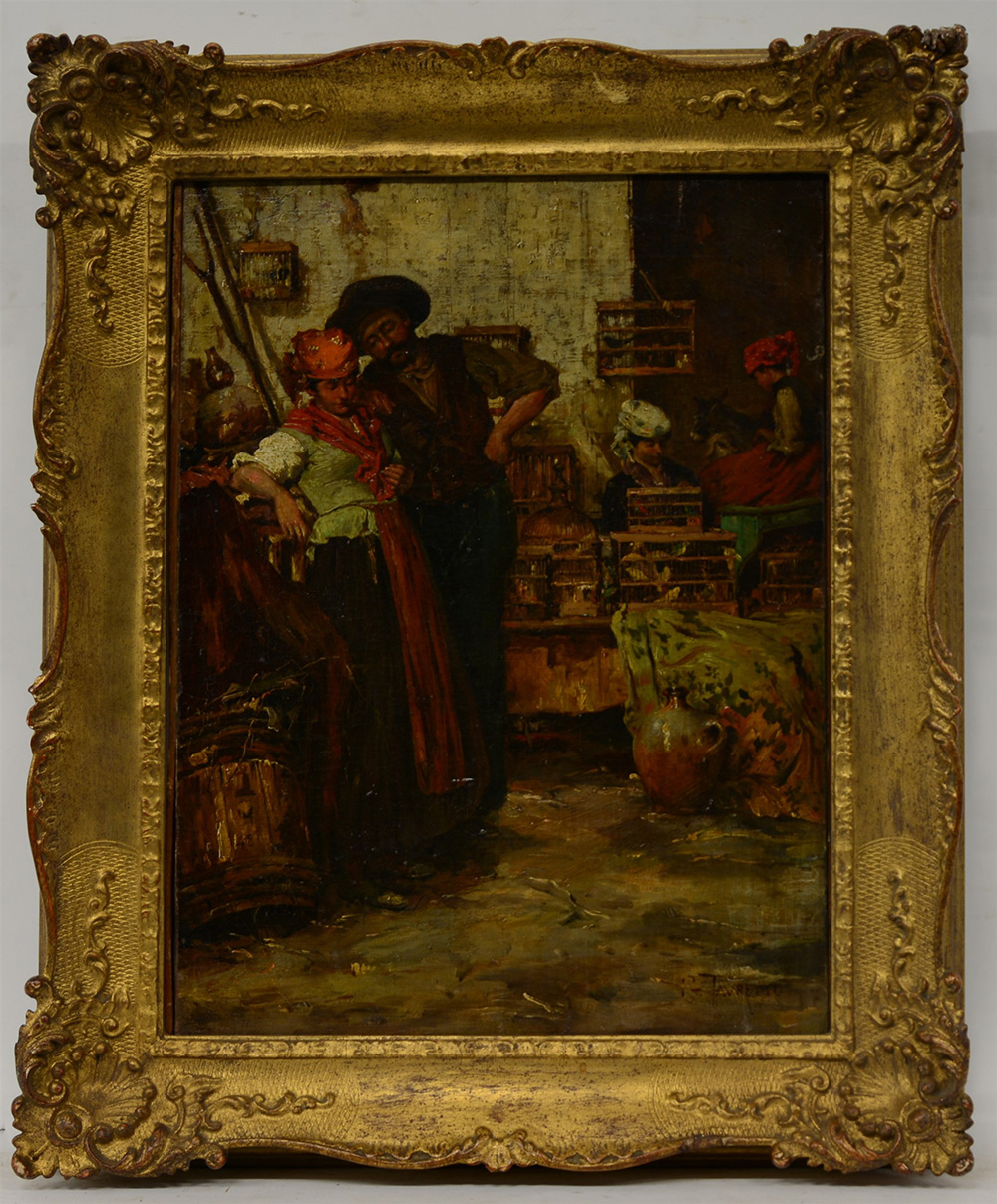 Ignoto del XIX Secolo "Venditore di uccelli" olio su tela (cm 46x33) Reca firma G.Favretto in basso a destra. Al retro: iscrizione datata 1942 di Alessandro Milesi. In cornice