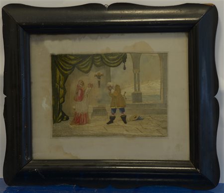 Arte del secolo XIX "Scena da i Promessi Sposi" ricamo (cm 20x26) in cornice...