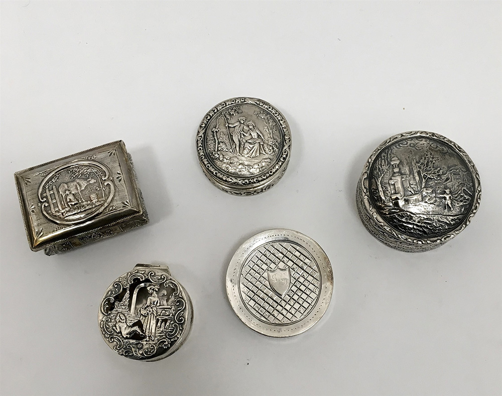 Manifatture europee, sec XIX. Lotto in argento composto da cinque scatole diverse (gr 260 ca.) (difetti)