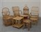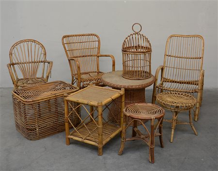 Lotto composto da tre poltrone, due sgabelli, due tavolini e due ceste in midollino, vimini e canne d'india. Anni 70/80 (difetti)