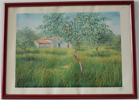 Firma indecifrata "Paesaggio" litografia (cm 42x60) firmata e datata in...