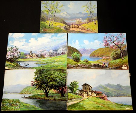 Ignoto "Scorci con laghi e montagne" gruppo di cinque tecniche miste su...