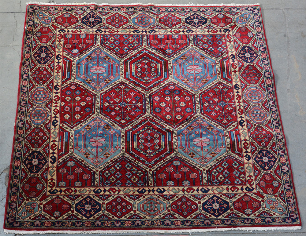 [Tappeti] Tappeto Sparta, Anatolia, secolo XX. Disegno a giardino in ogive ottagonali neit otni dell'azzurro, rosa e rosso (difetti)