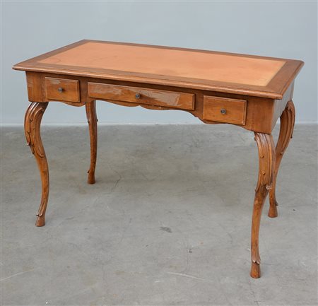 Scrittoio a tre cassetti nella fascia, gambe sagomate ed intagliate, piano rivestito in marocchino (cm 110x78x60)(difetti)