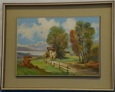 Ignoto "Paesaggio con scorcio di lago sullo sfondo" olio su compensato (cm...