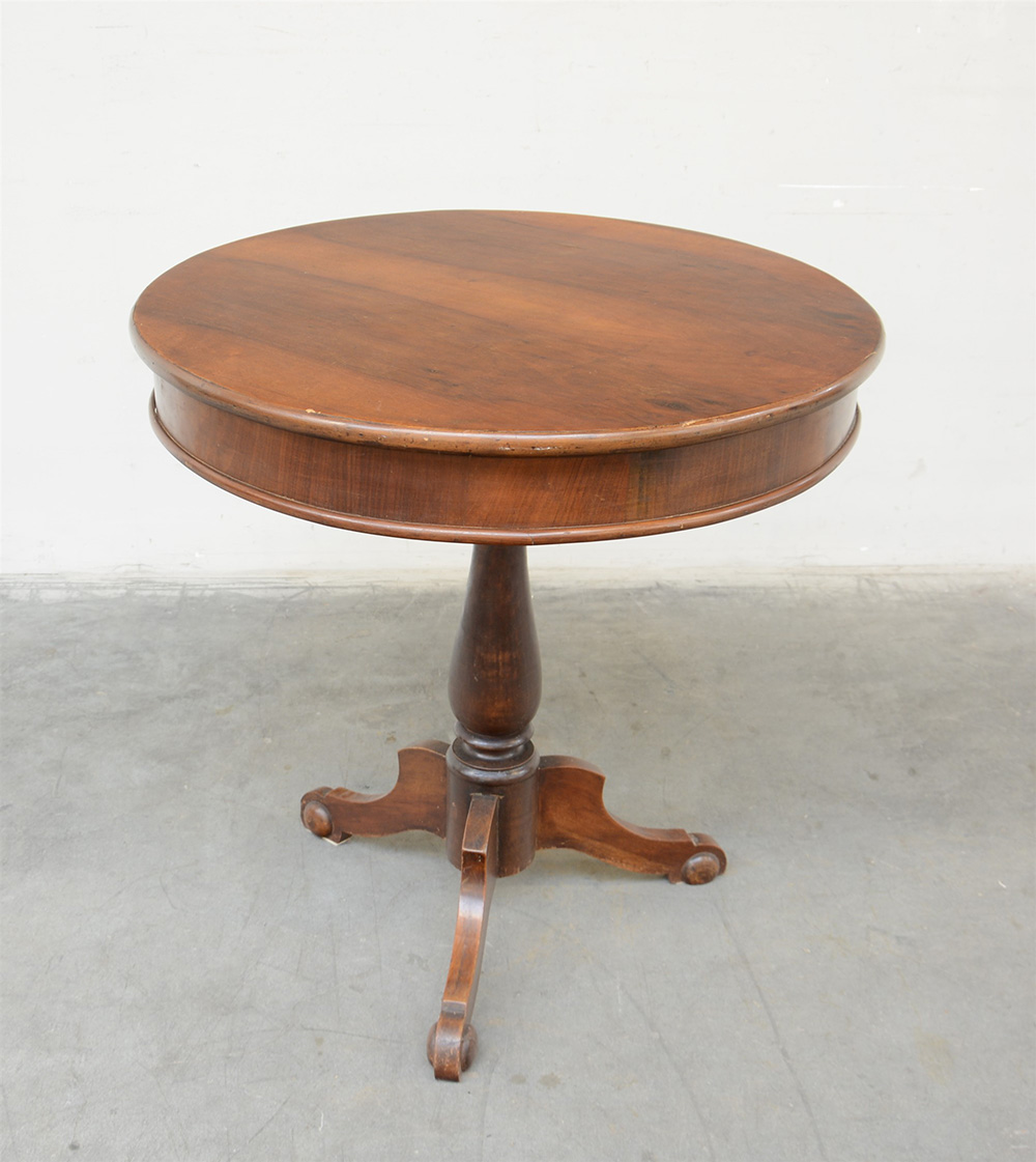 Tavolo in ncoe con piano tondo e gamba tornita con piede tripode (d cm 80 e h cm 80) (lievi difetti)