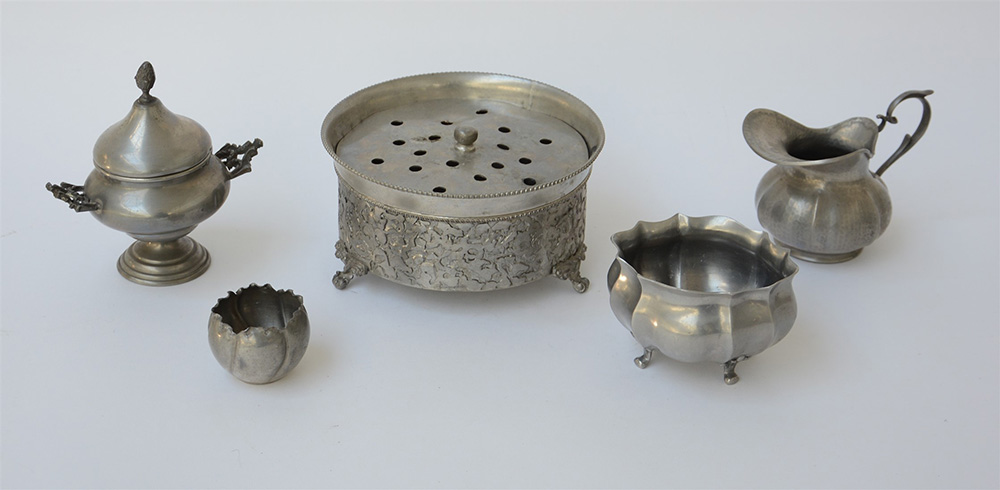 Lotto composto da cinque piccoli oggetti in peltro (lievi difetti)