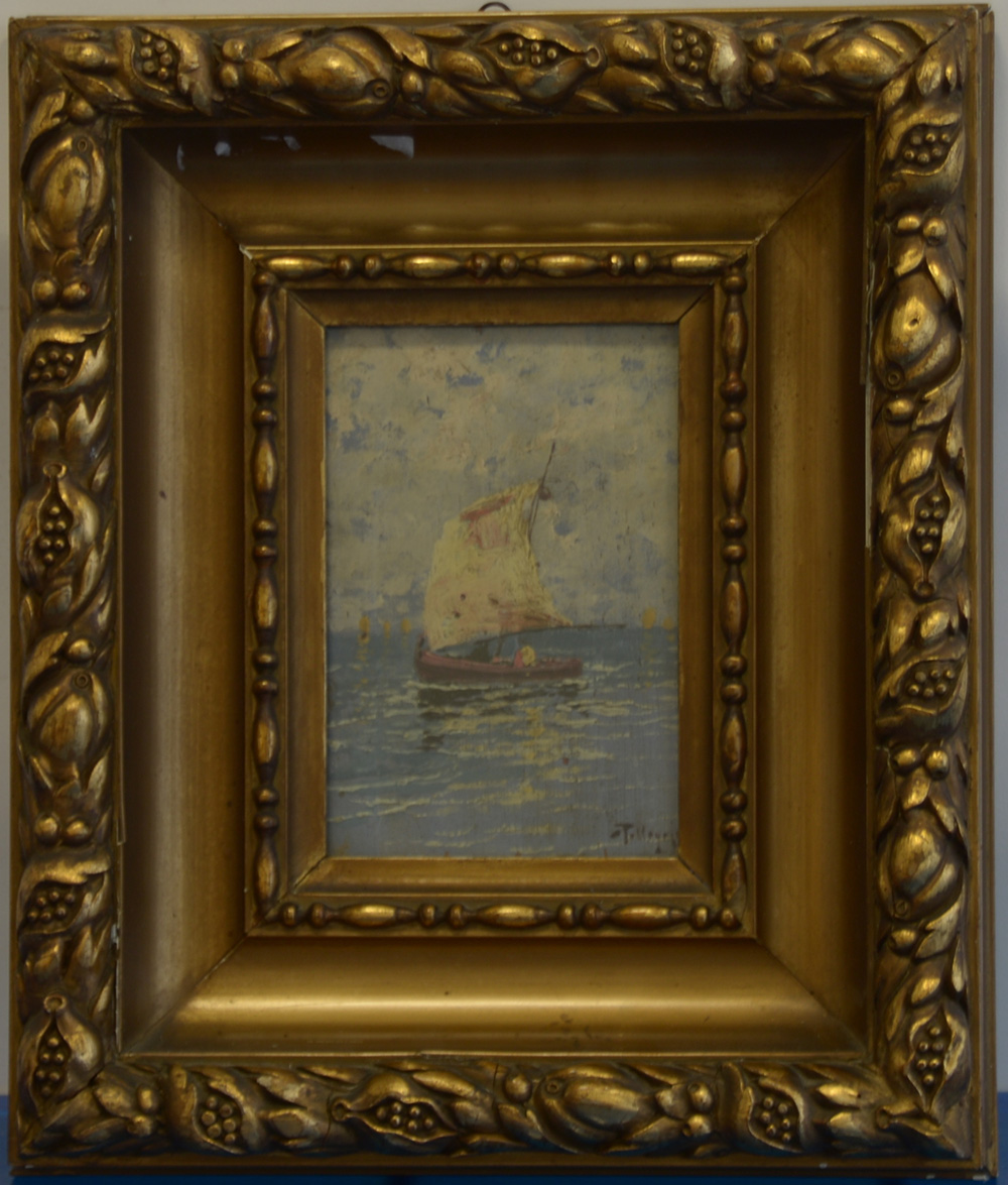 Scuola del secolo XIX "Marina con barca in primo piano" olio su tavoletta (cm 14x9,5) reca firma Pellegrini in basso a destra, in cornice (difetti)