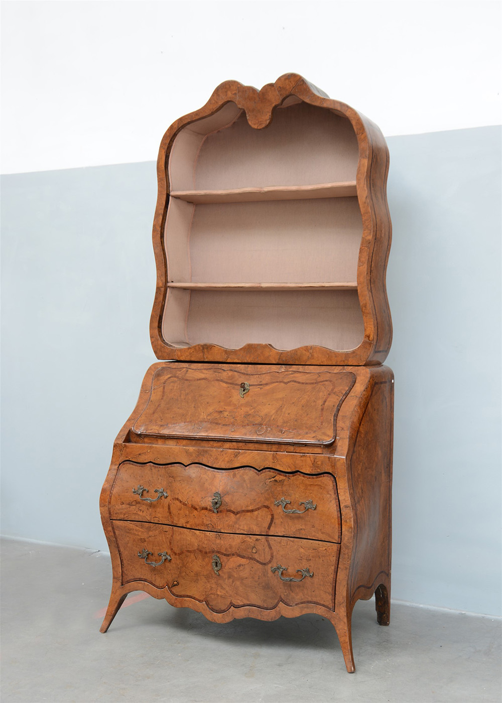 Antico trumeau genovese interamente lastronato e filettato, parte superiore con vani a giorno, parte inferiore a due cassetti e anta ribaltabile celante quattro cassettini in linea e vani (cm 112x 224x60)(difetti)