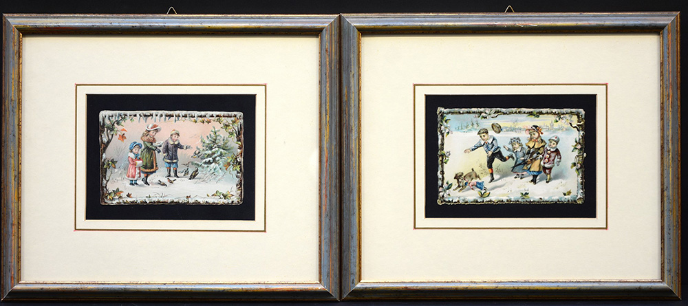 Coppia di piccole stampe a colori raffiguranti bimbi che giocano (cm 12x16) in cornice