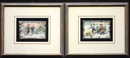 Coppia di piccole stampe a colori raffiguranti bimbi che giocano (cm 12x16)...