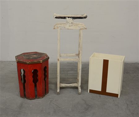 Lotto composto da un portaombrelli, un tavolino ottagonale ed un servomuto in legno laccato (difetti)