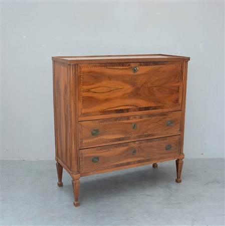 Mobile interamente lastronato e filettato, anta ribaltabile celante sette cassettini e vani, due cassetti nella parte inferiore, montanti scanalati e gambe rastremate (cm 110x120x48)(difetti)