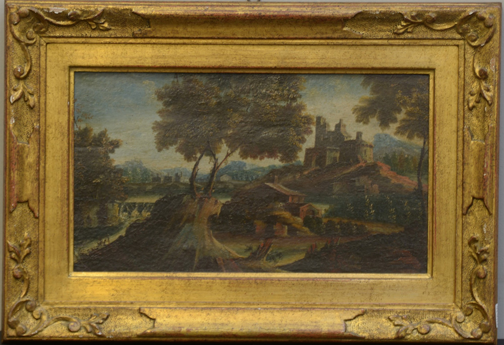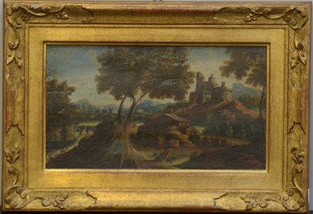 Ignoto "Paesaggio con manieri e corso d'acqua" olio su tavoletta (cm 19x33) in cornice