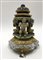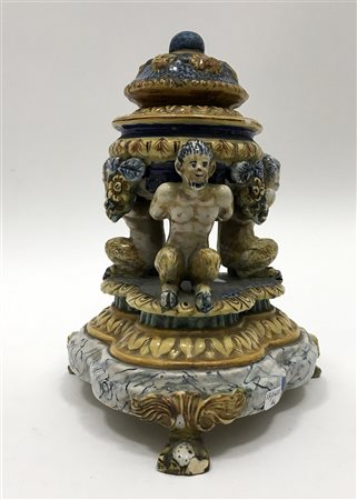 Calamaio in maiolica policroma, manifattura marchigiana, sec. XIX. La struttura del calamaio è rinascimentale con tre figure plastiche di satiri inginocchiati che reggono il calamaio con coperchio. Un'alta zoccolatura trilobata con tre piedi ferini fa da base all'insieme (h. cm 22) (difetti e restauri)