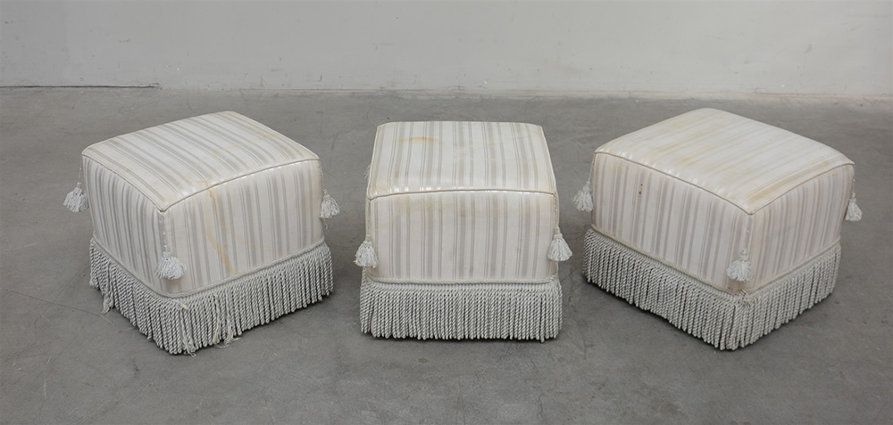 Lotto di tre pouff rivestiti in tessuto bianco rigato, decorati con frange, misure diverse (difetti)