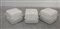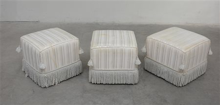Lotto di tre pouff rivestiti in tessuto bianco rigato, decorati con frange,...