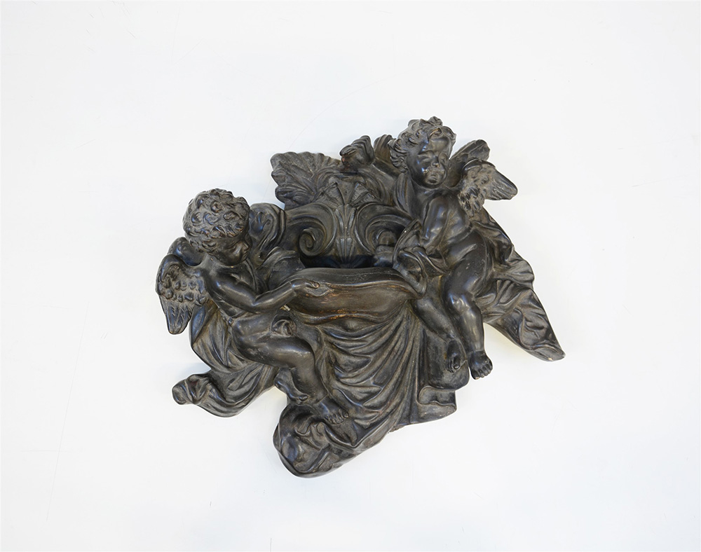 Acquasantiera in terracotta patinata a finto bronzo decorata da putti alati...