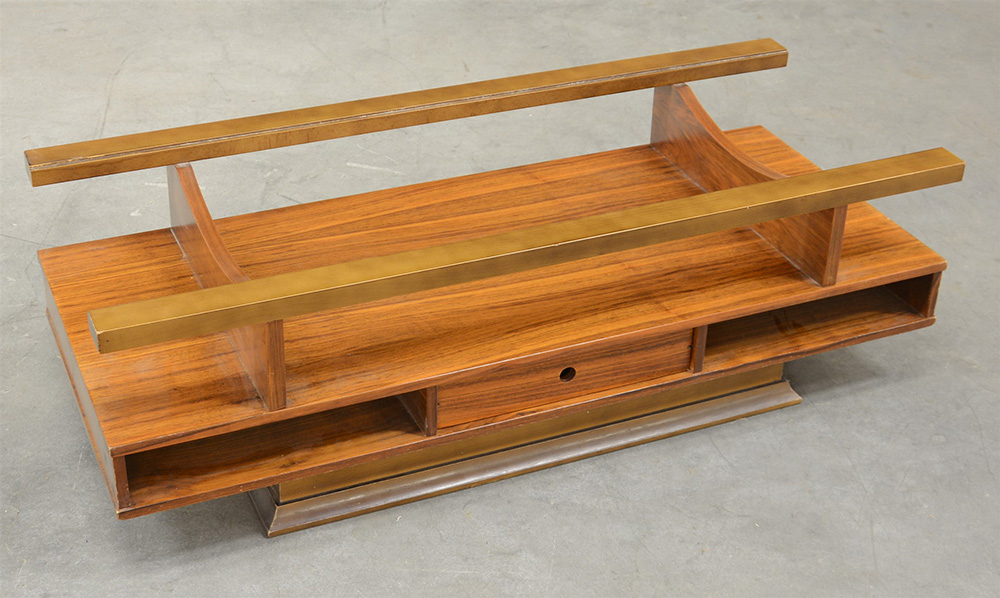 Tavolino da salotto in palissandro con vani e cassetto (cm 120x38x50) (piano in vetro mancante) (lievi difetti)