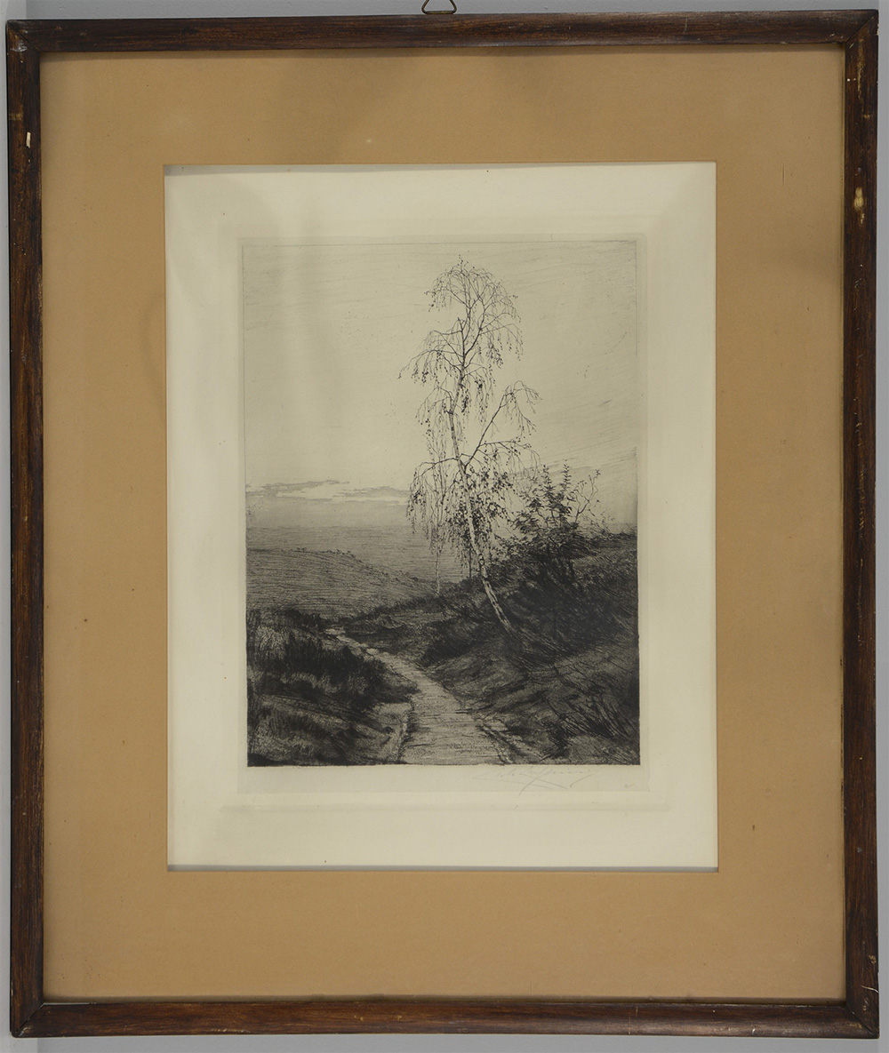 Firma indecifrata, "Paesaggio con betulla", acquaforte (battuta cm 34x25,7), firmato a lapis in basso a destra, in cornice (difetti)