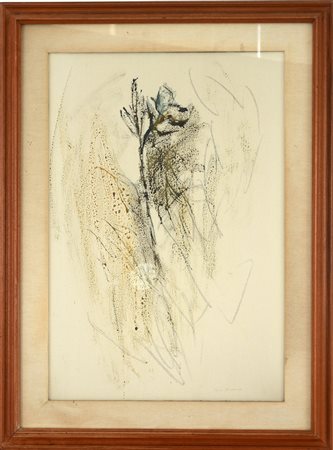 Ernesto Treccani (Milano 1920 - 2009) “Fiore” Tecnica mista su tela (cm 68x48) Firmato in basso a destra, al retro cartiglio de "La Vecchia Farmacia Galleria d' Arte Forte dei Marmi" con firma Paolo Marini, in cornice