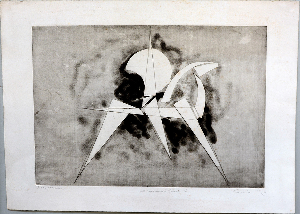 Carlo Mo (1923 - 2004) "Senza titolo" acquaforte/ acquatinta - prova d'artista (lastra cm 34,7x50; foglio cm 46x63). Inscritta, dedicata a Carlo Cardazzo e firmata in basso a matita (lievi difetti)
