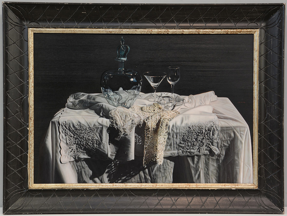 Giuseppe Carta (Banari 1950) "Composizione metafisica su tovaglia" 2006 - 2007 olio su tela applicata su tavola, (cm 55,5x80) Firmato al centro a destra. Titolato al retro. In cornice Bibliografia L. Caprile, "Giuseppe Carta: i seducenti percorsi della luce - Opere dal 1994 al 2007", Edizioni FLM, 2007