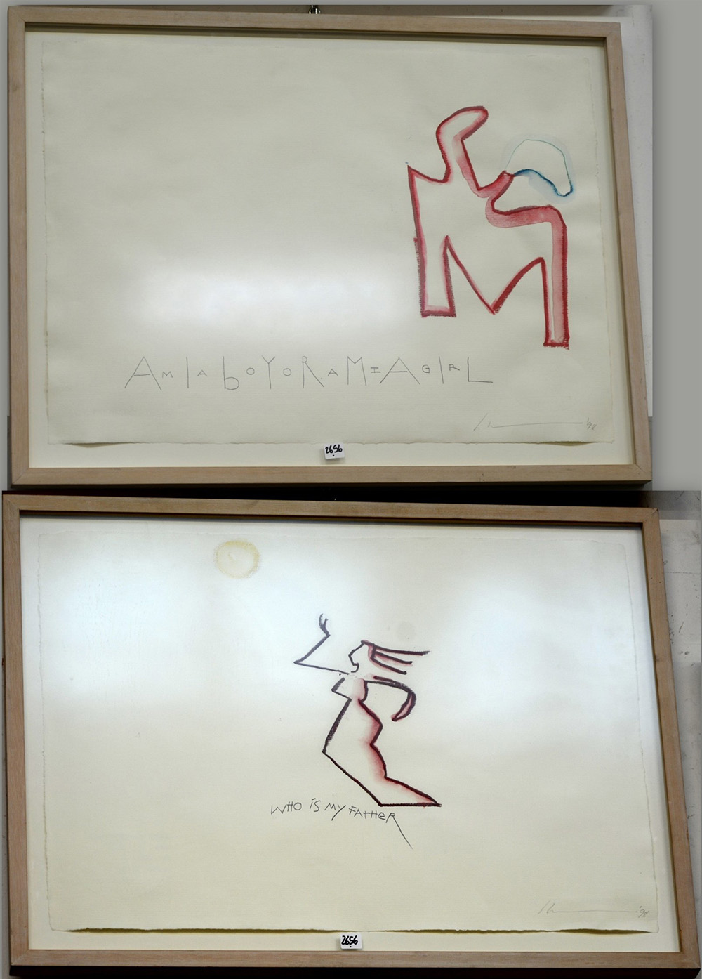 Firma indecifrata "Am I a Boy or am I a Girl" 1998, tecnica mista su carta e vetro, cm 48x66. Firmato e datato 98 in basso a destra. "Who is my Father" 1998, tecnica mista su carta e vetro, cm 48x66. Firmato e datato 98 in basso a destra. (2)in cornici