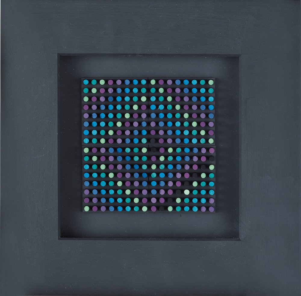 FRANCO COSTALONGA Venezia 1933 - CMSVV, gradienti di luminosità (plastiche) su masonite cm. 20x20, (dimensioni totali cm 29x29), firma e titolo al retro, dichiarazione d'autenticità dell'artista e timbro della Anti: Galleria d'Arte Contemporanea (Mestre-VE) su foto.