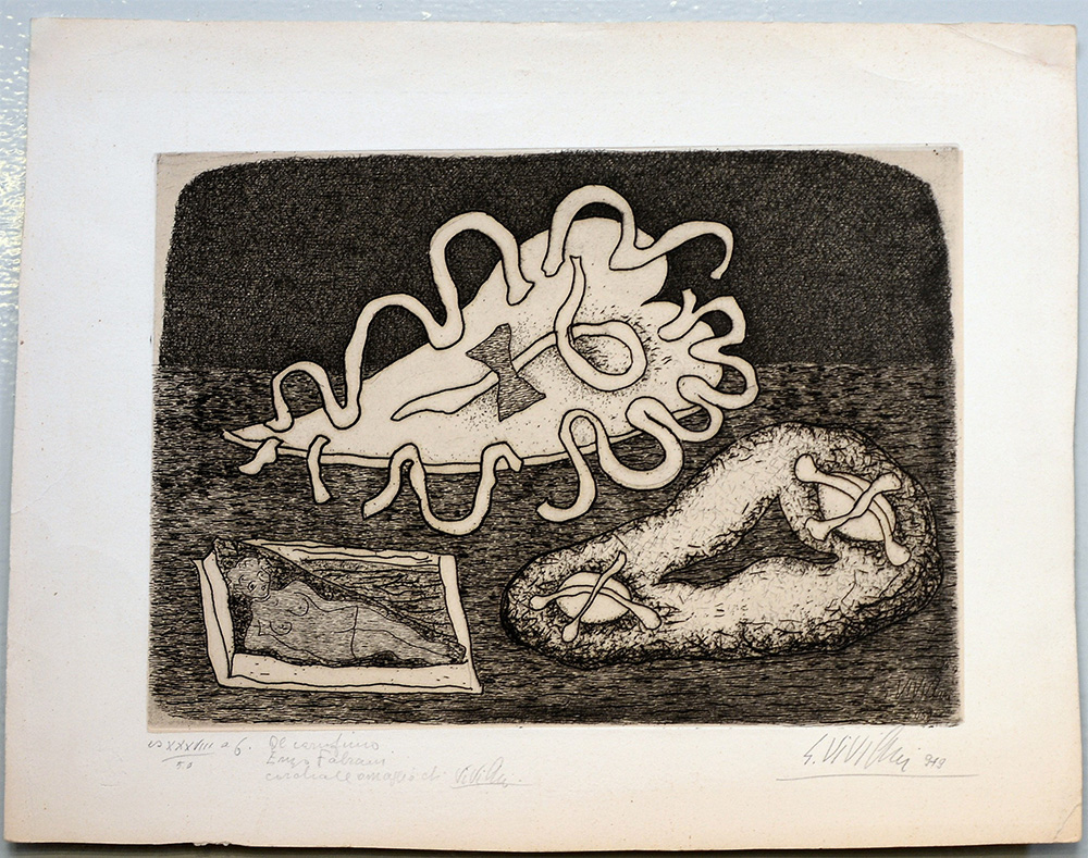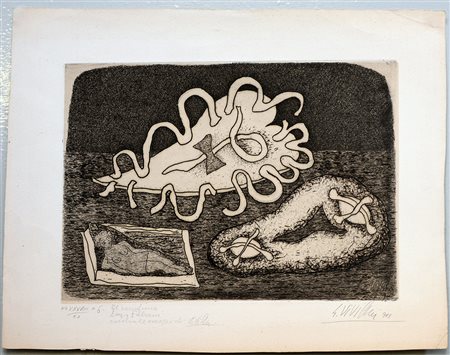 Giuseppe Viviani (Agnano di Pisa 1898 - Pisa 1965) "Dolci e bambola" 1949, acquaforte su rame (lastra cm 19x26,7; foglio cm 27,5x35) numerata XXXVIII/50, firmata e datata in basso a matita. Dedica autografa dell'artista ad Enzo Fabiani (lievi difetti) Bibliografia: "G. Viviani. Opera grafica" Rebellato Editore, Cittadella di Padova, 1960, n. 65.