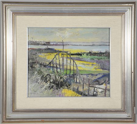 Michele Baretta (Vigone 1916 - 1987) "Po di Levante" 1980 olio su masonite (cm 24x30), firmato in basso a sinistra. Firmato e titolato al retro. In cornice