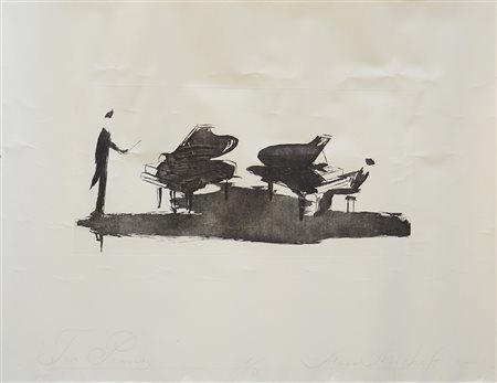 Alzek Misheff (Dupniza 1940) "Two Pianos" 2003, acquatinta (battuta cm 53x107; foglio 123,5x167) titolata, numerata 5/55 e firmata in basso a matita. Timbro a secco in basso a sinistra (Giorgio Upiglio). (Lievi difetti)