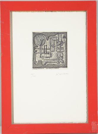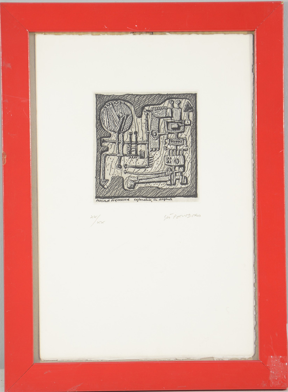 Giò Pomodoro (1930 - 2002) "Piccola macchina/ coperchio in argento" acquaforte (lastra cm 10x9,6; foglio cm 28,4x18,7) numerata XX/XX e firmata in basso a matita