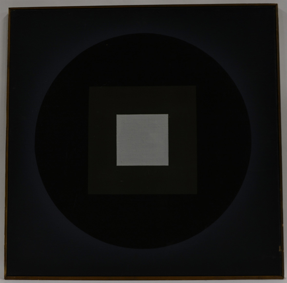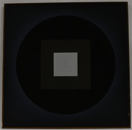 Helmut Zimmermann (1924 - 2015) "Quadrat im Kreis, nr. 3" 1970, olio su tela di juta (cm 74x74). Titolato, datato e firmato al retro. In cornice (difetti)