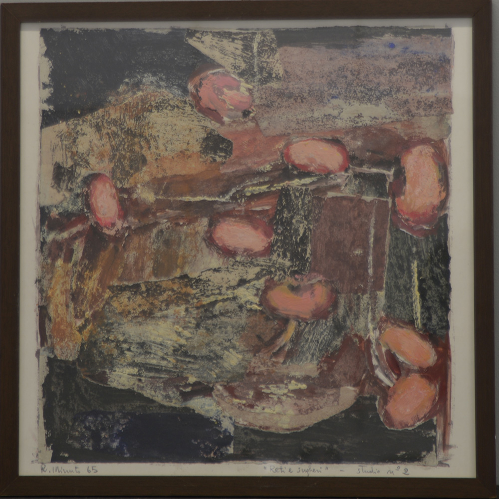 Renata Minuto (Savona 1934) "Reti e sugheri - Studio n. 2" 1965, tecnica mista e collage su cartoncino (cm 44x44). Firmata, datata e titolata in basso a matita (in cornice)